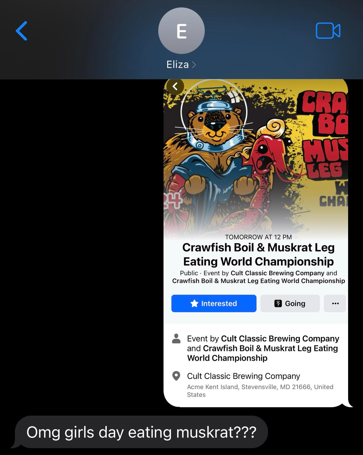 Not wanting to go alone, I ran through a mental list of which of my friends would not be disgusted by the idea of driving an hour to attend a rodent-eating competition. When my friend Eliza responded, “Omg girls day eating muskrat???” I knew we were in. The next day, we hit the road.