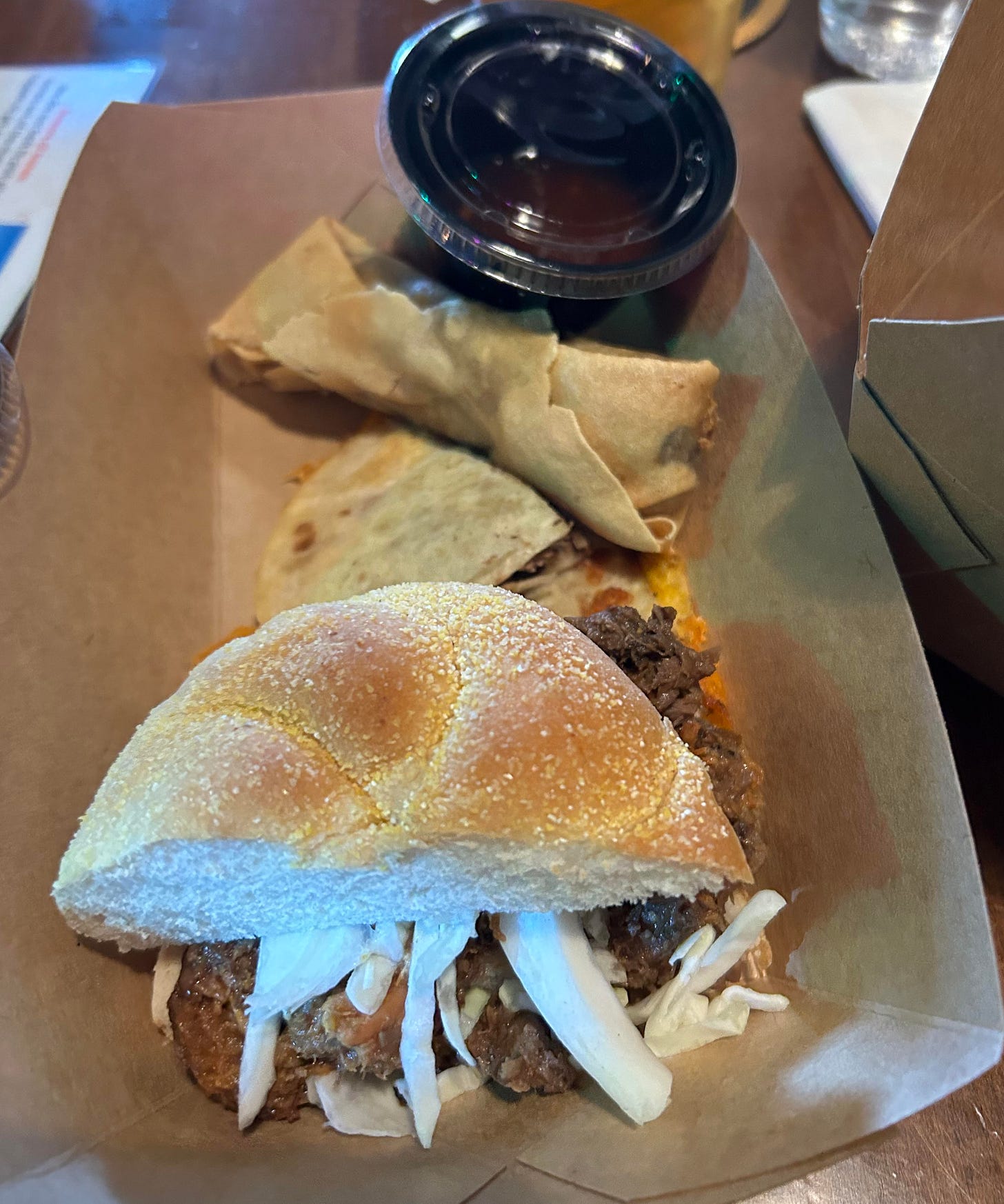 We pulled up to Cult Classic Brewery, where the event was being hosted, and decided to order the muskrat sampler platter which consisted of egg rolls, a quesadilla, and a sandwich resembling pulled pork–all made with locally-trapped muskrat–from the pop-up food truck. This was certainly not a time where I’d describe a meat as tasting like chicken. The muskrat resembled the look of pulled pork, but had a gamier, muddier taste (I know, I’m not exactly selling it). We agreed that the best thing on the plate was the quesadilla, where the meat blended into the melted cheese and tortilla. I see how it would be a good protein to be mixed into stews or Shepherd’s pies.